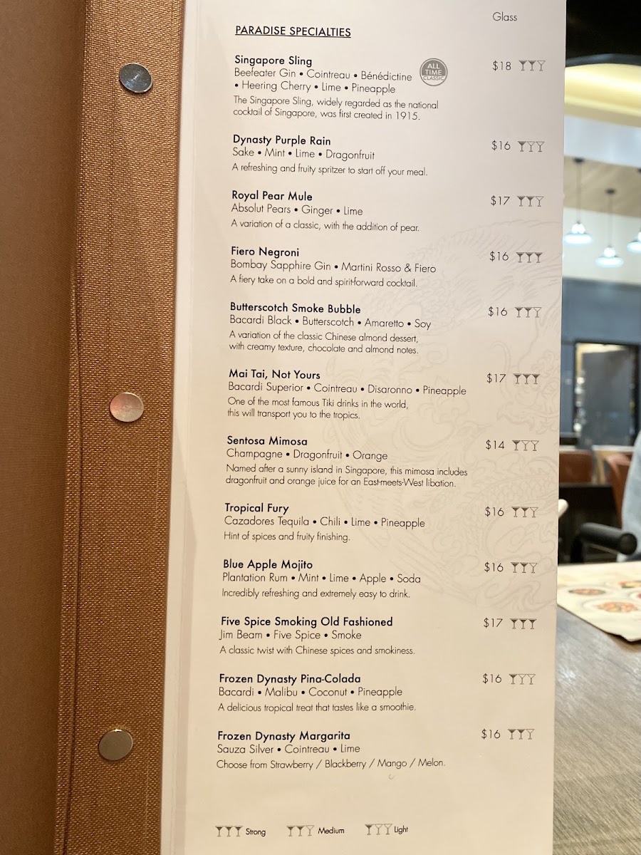 I had heard many good things about Paradise Dynasty and finally got to dine here with my family. We made reservations for lunch and didn't wait too long after checking in for our table to be ready. The menu features traditional Singapore cuisine as well as innovative specialties. We ordered plenty of the classic dishes to share, and everything was delicious. Prices are reasonable for most of the items, and it's a nice treat once in a while. A few of my favorites. - The XLBs (Dynasty Original and Shzechuan) - Wontons in Chili Oil are all flavorful with a hint of heat - Fried Rice dishes (we had the fried pork and chicken) - Fried Pork Chop has the light crispy shell and tender meat inside. - Pan-fried Kurobuta Pork Dumplings - Stir-fried French Bean w/ Minced Pork - Purple Rain cocktail is a sake-based cocktail with dragon fruit that's light on the alcohol and refreshing. - The Panda Chocolate Lava Buns were cute and fun to eat. Be careful of the chocolate lava which can ooze out quickly when bitten. The drink menu offers many options, including specialty cocktails, spirits, sake, and more. Happy Hour, which runs Monday through Friday from 2:30 p.m. to 5 p.m., offers excellent prices and plenty of items. The noodle soups look good, too, and I hope to try them next time. The service was excellent. Jabin was our main server, and he was energetic, kind, and attentive. There are plenty of tables to accommodate many patrons and bar seating to enjoy kitchen views. I can't wait to dine here again, try more of the menu, and enjoy my favorites.